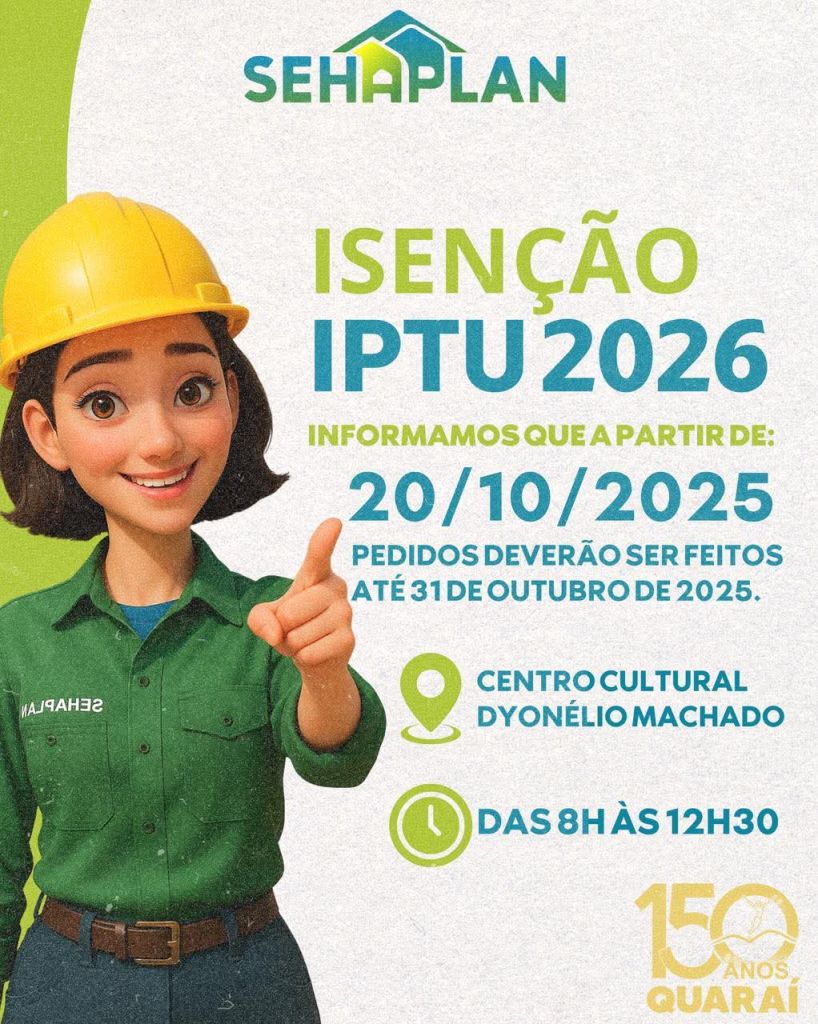 A Prefeitura de Quaraí, através da Sehaplan, informa que estará recebendo os pedidos de isenção do IPTU 2026 no período de 20 a 31 de outubro de 2025, no Centro Cultural Dyonélio Machado, das 8h às 12h30.