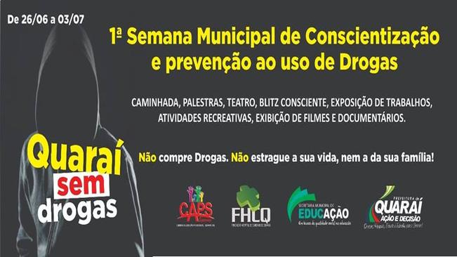 A Prefeitura de Quaraí, através da Secretaria Municipal de Educação estará promovendo, entre os dias 26 de junho a 03 de julho, à 1ª Semana Municipal de Combate e Prevenção ao uso de Drogas. Estão programadas inúmeras atividades, entre elas, caminhada, palestras, conversas informativas nas escolas, blitz consciente, exibição de filmes e documentários, exposição de trabalhos e atividades de conscientização, recreativas, etc. Para a Gestão Municipal, esse tema suscita diversas discussões na sociedade e reforça cada vez mais o apoio a essa luta, também por acreditar que, o uso dessas substâncias psicoativas acarreta em diversos problemas para o usuário e sua família em todos os âmbitos da vida, debilitando-o psicologicamente, emocionalmente, economicamente e principalmente fisicamente, formando um contexto sócio cultural e de saúde complexos. As ações serão realizadas de forma integrada pelas Secretarias de Educação e Cultura, Saúde, Assistência Social, Desporto e Lazer.