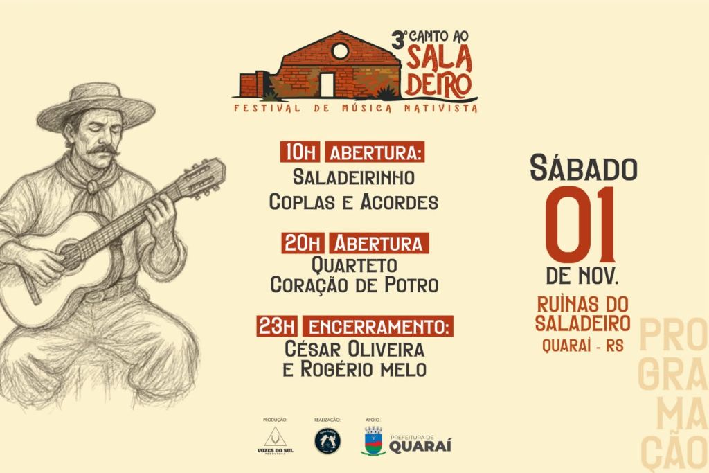 Com produção da Vozes do Sul Produtora no dia 1º de novembro de 2025, Quaraí será palco do 3º Canto ao Saladeiro, um dos principais eventos culturais da região, promovido pela Prefeitura Municipal.