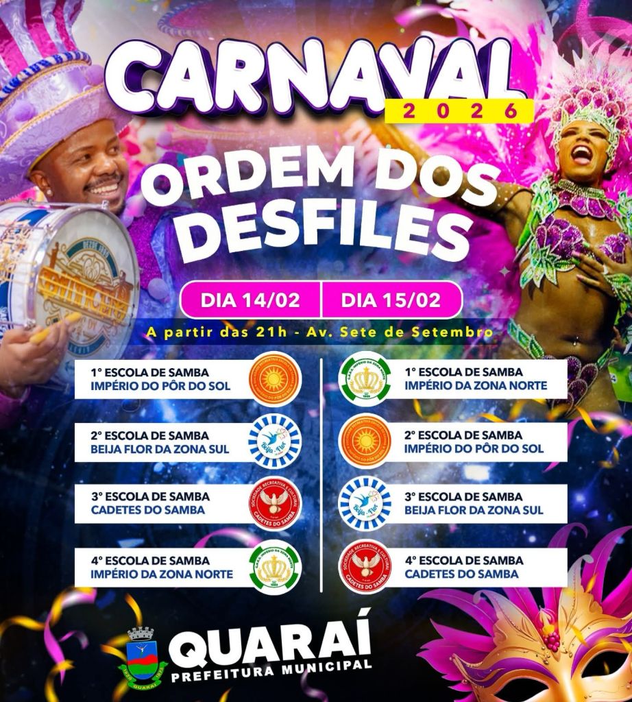 Com isso, divulgamos oficialmente a ordem dos desfiles que acontecerão nos dias 14 e 15 de fevereiro, a partir das 22h, na Avenida Sete de Setembro.