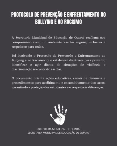 A Secretaria Municipal de Educação de Quaraí apresenta o Protocolo de Prevenção e Enfrentamento ao Bullying e ao Racismo na rede municipal de ensino.
