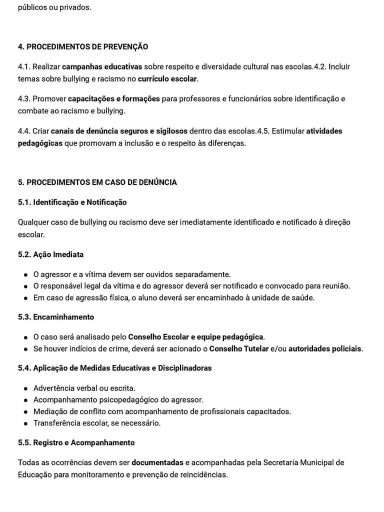 O documento estabelece orientações para a prevenção, identificação e encaminhamento de situações que envolvam práticas de bullying e discriminação racial no ambiente escolar, com o objetivo de garantir um espaço seguro, inclusivo e respeitoso para todos os estudantes.